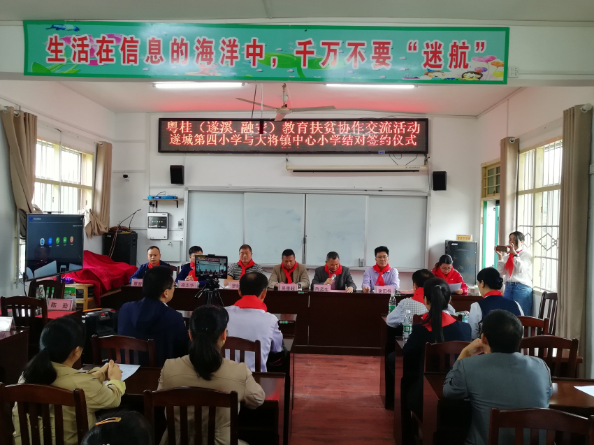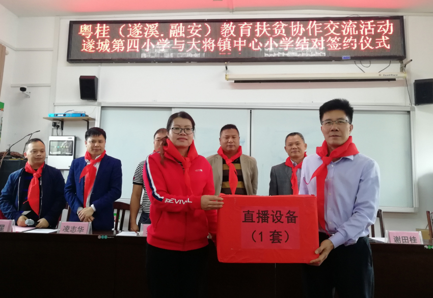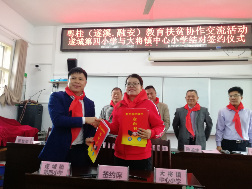 為深入開(kāi)展粵桂扶貧協(xié)作教育交流協(xié)作和幫扶工作,落實(shí)遂溪融安兩縣教育局簽訂的教育幫扶協(xié)作協(xié)議,進(jìn)一步加強(qiáng)兩縣校際之間合作,10月16—19日,遂溪縣教育局謝田桂副局長(zhǎng)帶領(lǐng)遂溪縣遂城第四小學(xué)一行11人到融安縣大將鎮(zhèn)中心小學(xué)開(kāi)展對(duì)接交流活動(dòng),并舉行捐贈(zèng)儀式。遂溪縣駐融安縣扶貧協(xié)作工作組吳垂超、大將鎮(zhèn)黨委書(shū)記羅財(cái)政參加活動(dòng)。