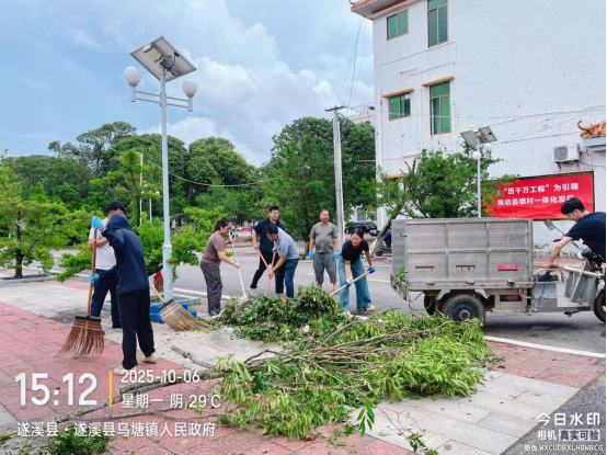 臺風過境后,為盡快恢復平和與秩序,鎮(zhèn)黨委、政府第一時間進行部署,迅速組織 35 支救援隊伍,統(tǒng)籌調配挖掘機、裝載機、清運車等作業(yè)設備,以“先通后凈、全面覆蓋”為原則,對轄區(qū)內主次干道、背街小巷等周邊重點區(qū)域開展集中清理行動。在清運車難以駛入的狹窄巷道,志愿者們帶著鐵鍬、掃帚、垃圾袋等工具,逐一清理墻角、綠化帶內的雜物,并協(xié)助商鋪檢查廣告牌,對輕微傾斜的小型廣告牌,合力進行手動加固,對存在嚴重安全隱患的廣告牌,則及時標記并聯(lián)系專業(yè)人員處理,全力守護行人腳下的安全。鎮(zhèn)黨委書記親赴電力搶修現(xiàn)場,慰問堅守一線的供電維修人員,為他們送去飲用水等慰問品,洪文澤書記指出:電力是群眾生活保障的關鍵,要在確保安全的前提下,爭分奪秒推進搶修,盡快恢復全鎮(zhèn)供電,讓群眾能點亮家里的燈、做好團圓飯,安穩(wěn)過中秋。