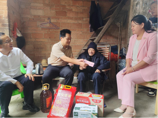 接著,慰問組前往羅屋村看望慰問另一位百歲老人羅培成。今年101歲的羅培成老人雖然年事已高,但精神狀態(tài)良好,見到慰問組一行前來,熱情地招呼大家入座。蒲火元副縣長緊緊握住老人的手,關(guān)切地說:“老人家,重陽節(jié)快到了,我們代表縣委、縣政府來看望您,祝您身體健康、福壽綿長!”他與老人促膝長談,仔細(xì)聆聽老人講述過往的生活經(jīng)歷,詢問老人的身體狀況和家庭情況。當(dāng)?shù)弥先似綍r(shí)飲食規(guī)律、兒孫孝順、生活幸福時(shí),蒲火元副縣長十分欣慰。他指出,百歲老人是家庭的福氣,更是社會(huì)的寶貴財(cái)富,他們的健康長壽不僅體現(xiàn)了家庭的和睦孝順,也反映了當(dāng)?shù)亓己玫纳鷳B(tài)環(huán)境和民生保障水平。隨后,慰問組為老人送上了米、面、油、慰問金等慰問品,祝愿老人身體健康、笑口常開。老人及其家屬對(duì)縣委、縣政府的關(guān)心和慰問表示衷心感謝,紛紛表示感受到了黨和政府的溫暖,今后會(huì)更加珍惜幸福生活,好好保重身體。
