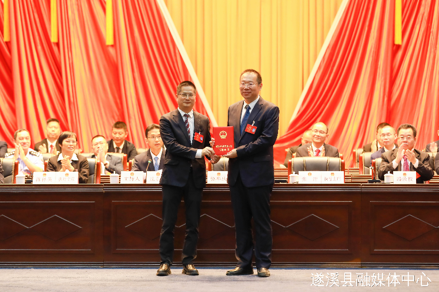上午11時,大會舉行第二次全體會議,采取無記名投票方式選舉張洋為遂溪縣人民政府縣長。駱華慶為新當選的縣長張洋頒發(fā)當選證書。