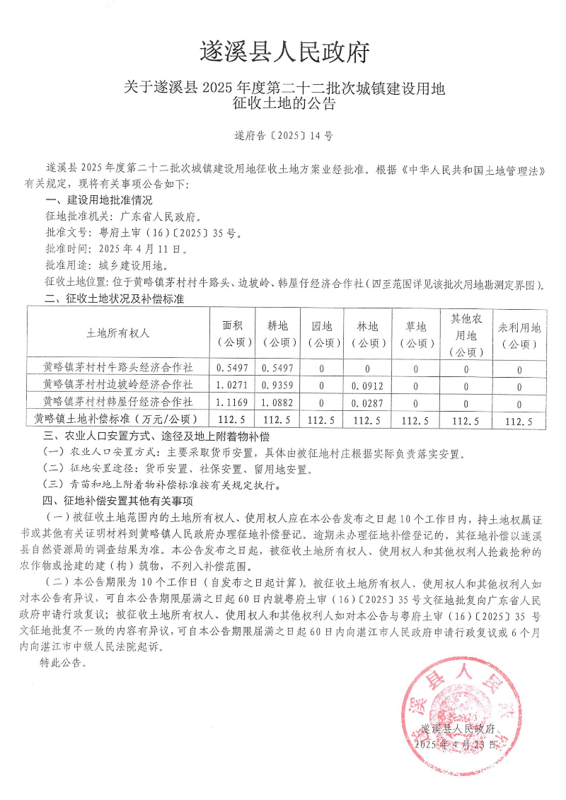 遂溪縣人民政府 關(guān)于遂溪縣2025年度第二十二批次城鎮(zhèn)建設(shè)用地征收土地的公告 遂府告〔2025〕14號(hào) | | 作者: | 來(lái)源:遂溪縣人民政府 | 時(shí)間:2025-04-23 17:21:29 點(diǎn)擊數(shù):- 【打印正文】