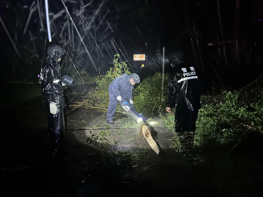 林林副縣長帶隊青年民警突擊隊、機動訓(xùn)練大隊和交管大隊等應(yīng)急力量,趕赴G207、G228等主干道,扶起狂風(fēng)吹倒的中間防護欄,鋸砍斷并移開倒在路間的樹木,支起倒下的廣告牌,在積水深路段樹立警示牌,筑起守護人民生命財產(chǎn)安全防線。
