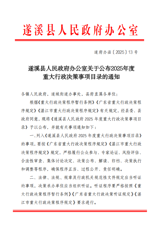 遂溪縣人民政府辦公室關(guān)于公布2025年度重大行政決策事項(xiàng)目錄的通知 | | 作者: | 來源:縣府辦 | 時(shí)間:2025-10-15 16:52:20 點(diǎn)擊數(shù):- 【打印正文】